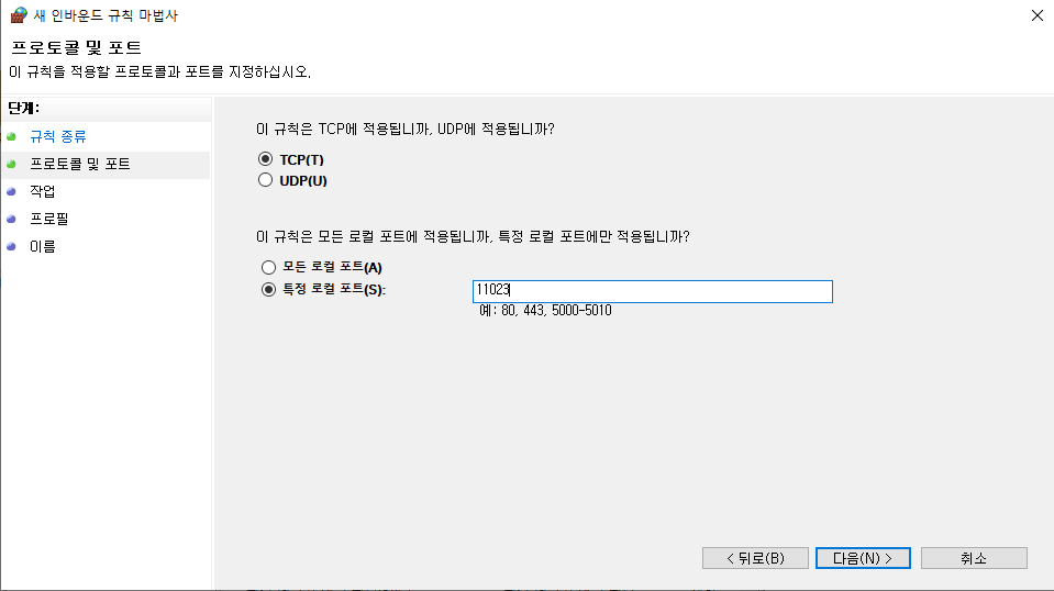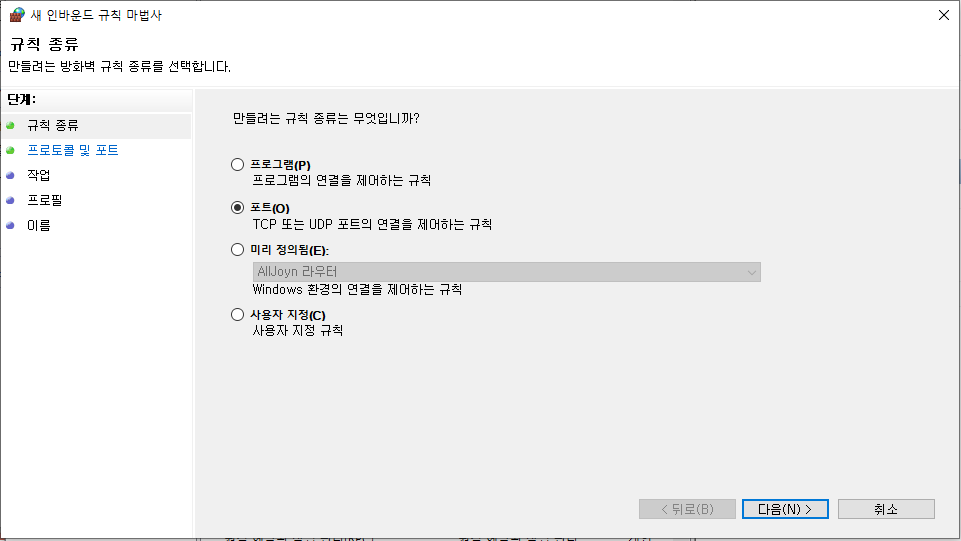 5. 포트를 선택하고 다음으로 넘어갑니다.