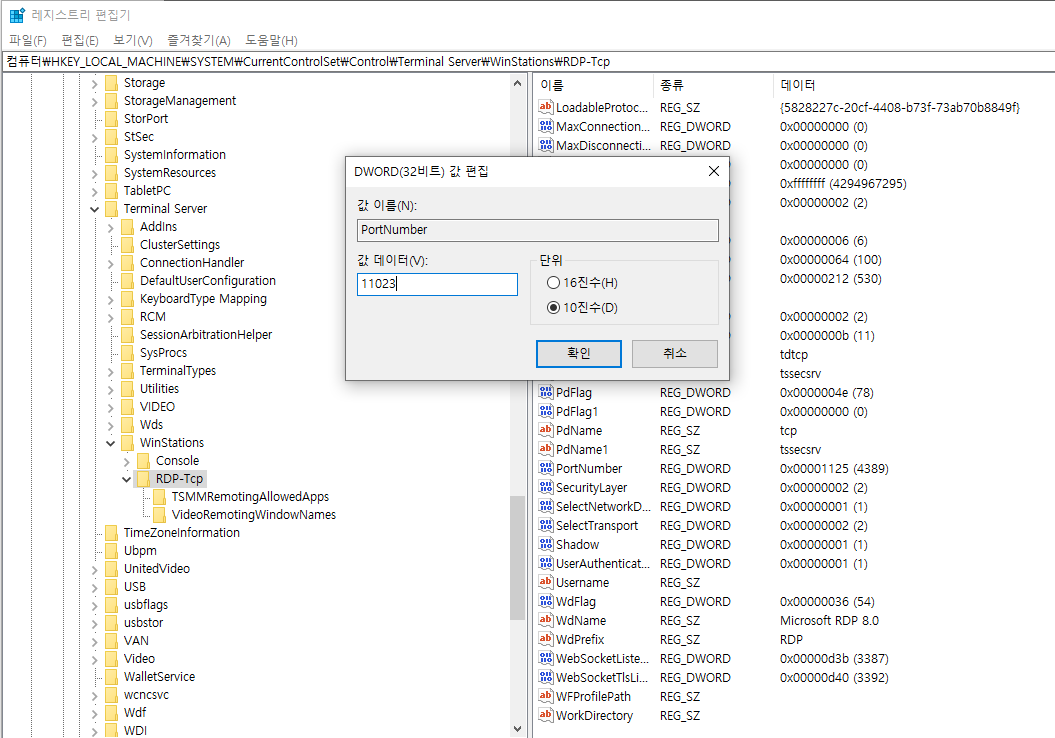 3. PortNumber을 오른쪽 클릭한뒤 수정을 클릭합니다. 값 데이터를 3389에서 다른 원하는 포트로 등록합니다. 저는 11023을 원격 포트로 등록하겠습니다.
