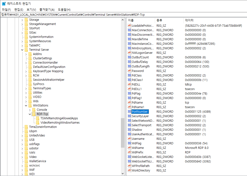 컴퓨터\HKEY_LOCAL_MACHINE\SYSTEM\CurrentControlSet\Control\Terminal Server\WinStations\RDP-Tcp
