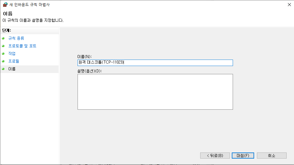 7. 원격 데스크톱 (TCP-11023)이 방화벽에 등록되었습니다. 서비스를 열어 Remote Desktop Services를 선택하고 서비스 다시 시작을 클릭합니다. 이후에는 원격접속이 정상적으로 되는지 확인해주세요.