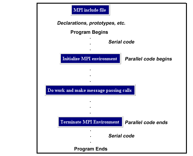 실제적인 MPI 애플리케이션은 서로 정보를 주고받는 여러개의 프로세스들로 이루어져 있는데, 이 각각의 프로세스들은 MPI 애플리케이션이 구동될 때에 모두 병렬적으로 시작된다. 이 각각의 프로세스들은 모두 하나의 문제를 풀기위해 한 프로세스에서 다른 프로세스로 데이터와 정보들을 필요에 따라 서로 주고 받게 된다. 이러한 원리의 장점은 하드웨어적으로 분산되어있는 컴퓨터들 간에도 이런 데이터와 정보들을 주고 받을 수 있다는 점이다. 그래서 특별히 병렬처리를 위해 만들어진 병렬 컴퓨터(공유 메모리를 지녔다거나, 인피니밴드 혹은 Myrinet 등을 통해 고속으로 정보를 주고받는 것이 가능하게 만들어진) 뿐만 아니라, (TCP를 통해 정보들이 교환되는) PC 들로 이루어진 PC 클러스터(PC-Cluster) 에서도 이런 병렬 MPI 프로그램들은 잘 돌아간다.